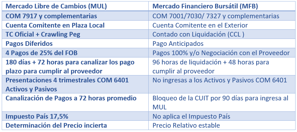 A nuestro criterio, es el momento ideal para cambiar al (MFB) Mercado Financiero Bursátil proyectando nuevas importaciones estacionarias para los periodos del 2do semestre del año. Todos los que estén en situación de cierres de compromisos con el exterior en forma inmediata estarías liberados de elegir dentro del marco legal el acceso al MFB sin complicaciones, evitando el Impuesto País del 17,5% , fijando un valor de referencias de los productos aportando una estabilidad a las proyecciones de las empresas y del mercado.